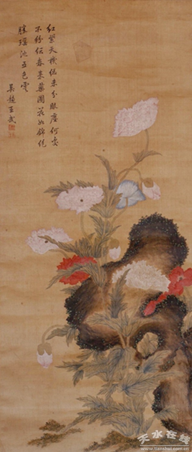 芍藥還是花鳥畫中經(jīng)常表現(xiàn)的對象。宋畫中就有芍藥的身影。徐渭、華嵒、張大千、齊白石等歷代名家都畫過芍藥。天水市博物館就收藏有一件王武繪芍藥圖立軸。這件作品縱98厘米、橫41.2厘米,為絹質(zhì),以工筆設(shè)色繪成。圖中繪芍藥數(shù)株掩映于太湖石前后。這幅畫中的芍藥高低錯落,風(fēng)姿綽約,花葉以淡墨勾勒后又通過渲染表現(xiàn)葉的陰陽相背;ǖ男螒B(tài)則或盛放、或半放、或昂首、或低頭,而花色或白、或粉、或紅、或藍(lán)皆生意盎然;ㄩg掩映的太湖石用積墨的明暗突出石體的嶙峋剔透之態(tài),石上用石青點(diǎn)苔,平添了幾分清麗。整個畫面設(shè)色細(xì)潔光潤,明快雅致,在絹色的襯托下又顯得精巧傳神,既有自然之姿,又似嫻雅美人儀態(tài)萬千。畫面左上角題詩一首:
