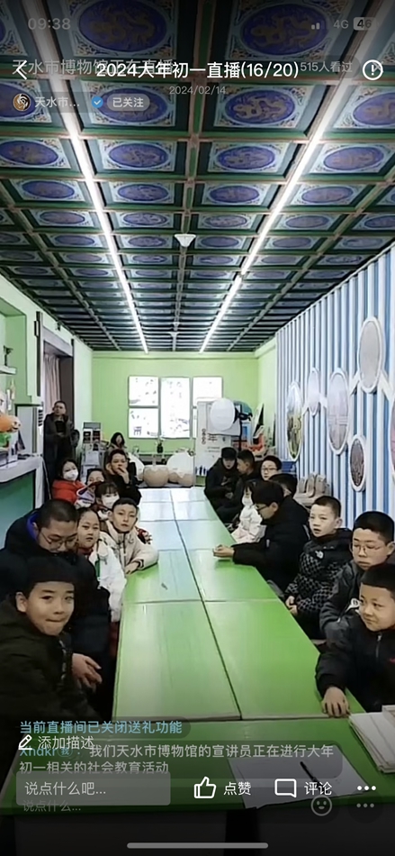天水市博物館2024甲辰龍年春節(jié)系列活動,是深入學(xué)習(xí)習(xí)近平文化思想,進(jìn)一步貫徹落實(shí)習(xí)近平總書記關(guān)于文物工作的重要論述和指示批示精神,并結(jié)合工作實(shí)際,策劃立足博物館館藏文物,深挖天水當(dāng)?shù)靥厣袼,通過線下展示+線上直播的方式,充分詮釋具有地域性的春節(jié)文化內(nèi)涵,有力展示了天水市博物館持續(xù)推進(jìn)文博事業(yè)高質(zhì)量發(fā)展的有力舉措,為廣大觀眾獻(xiàn)上一場場精彩的文化盛宴,整個春節(jié)文化系列活動取得了良好的社會效果。