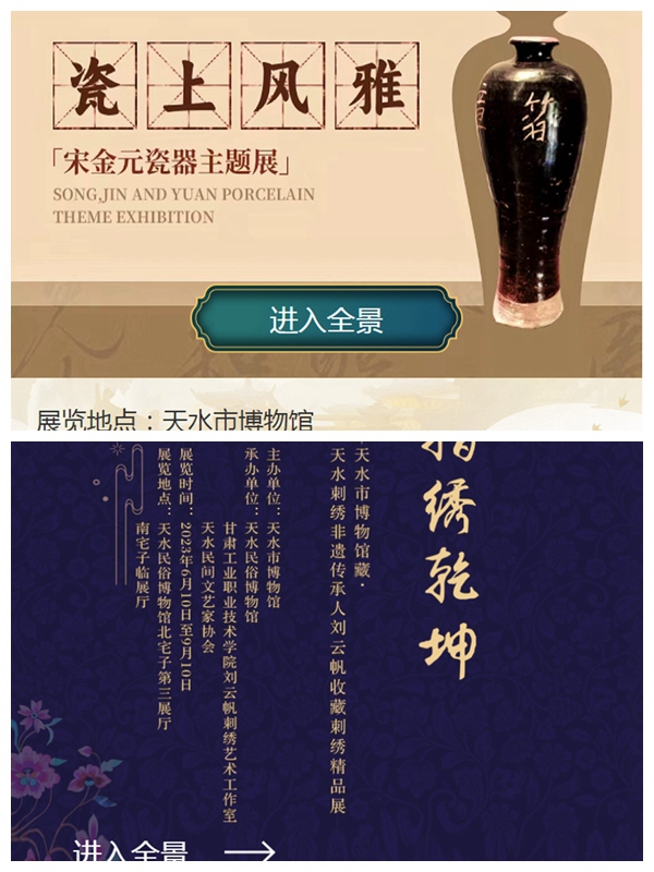 天水市博物館不斷優(yōu)化線上宣傳內(nèi)容輸出,聯(lián)合中電萬維信息技術(shù)有限責(zé)任公司推出了天水市博物館“瓷上風(fēng)雅——宋金元主題展”數(shù)字云展覽,天水民俗博物館“十指繡乾坤”數(shù)字云展覽等內(nèi)容。