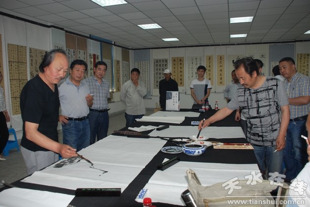 在展覽觀看結(jié)束時(shí),經(jīng)漢中市群藝館高權(quán)主席組織,受漢中市委宣傳部副部長魯玉仁、漢中市書法家協(xié)會(huì)副主席火生珍、甘肅商會(huì)天水籍會(huì)長孫永樂等邀請(qǐng),甘肅蘭州、天水、隴南等地與會(huì)代表與漢中市工作的甘肅籍美術(shù)書法家們匯聚一堂,舉行了書畫筆會(huì)交流活動(dòng)。在筆會(huì)交流中,大家相互探討書畫創(chuàng)作感受,共敘家鄉(xiāng)情誼,同謀交流發(fā)展,并協(xié)議在甘肅商會(huì)的大力支持下,今后積極鼓勵(lì)甘肅美術(shù)書法作品參加多元文化交流,促進(jìn)甘肅各地書畫創(chuàng)作。