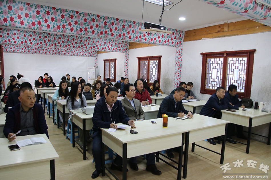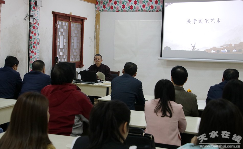 市委宣傳部講師團團長郭黎平、市文化和旅游局相關領導、市文化館全體職工、秦州區(qū)文化館班子成員及全體黨員等近80余人聆聽了講座。