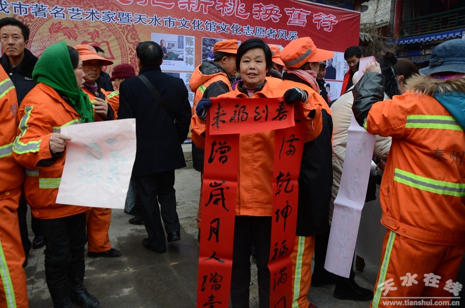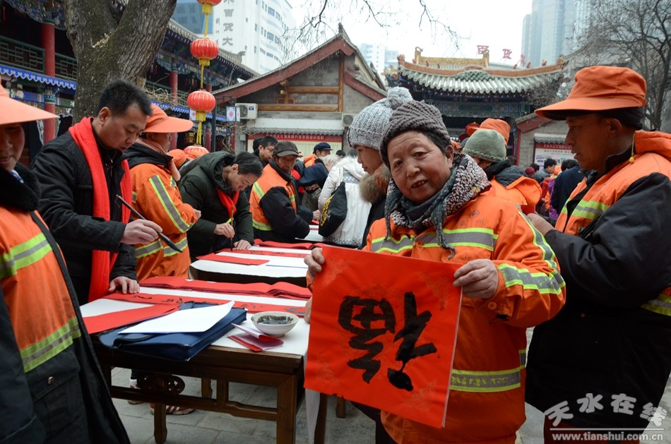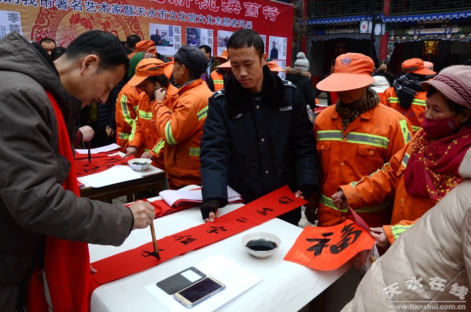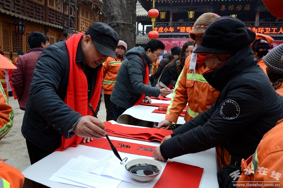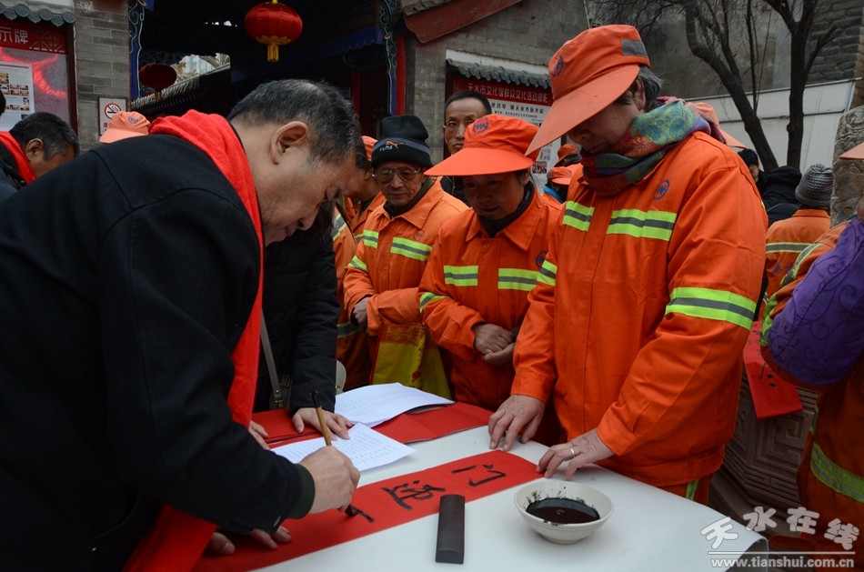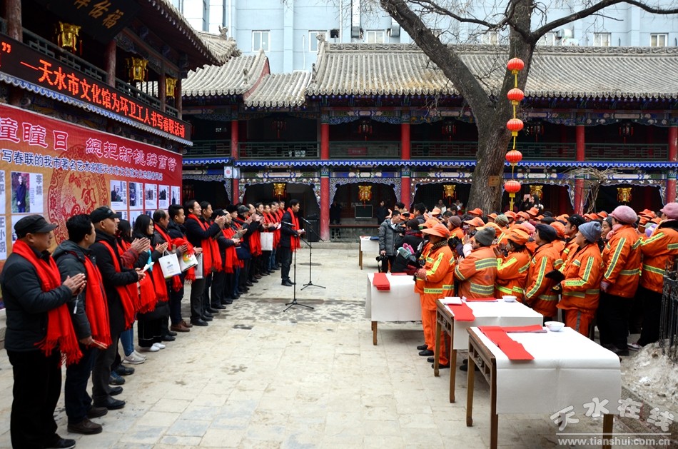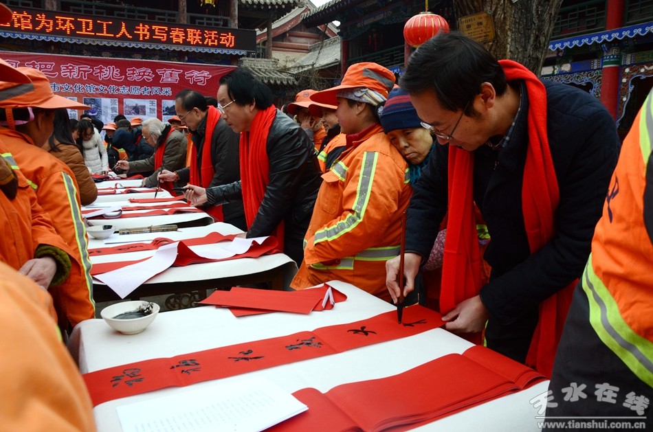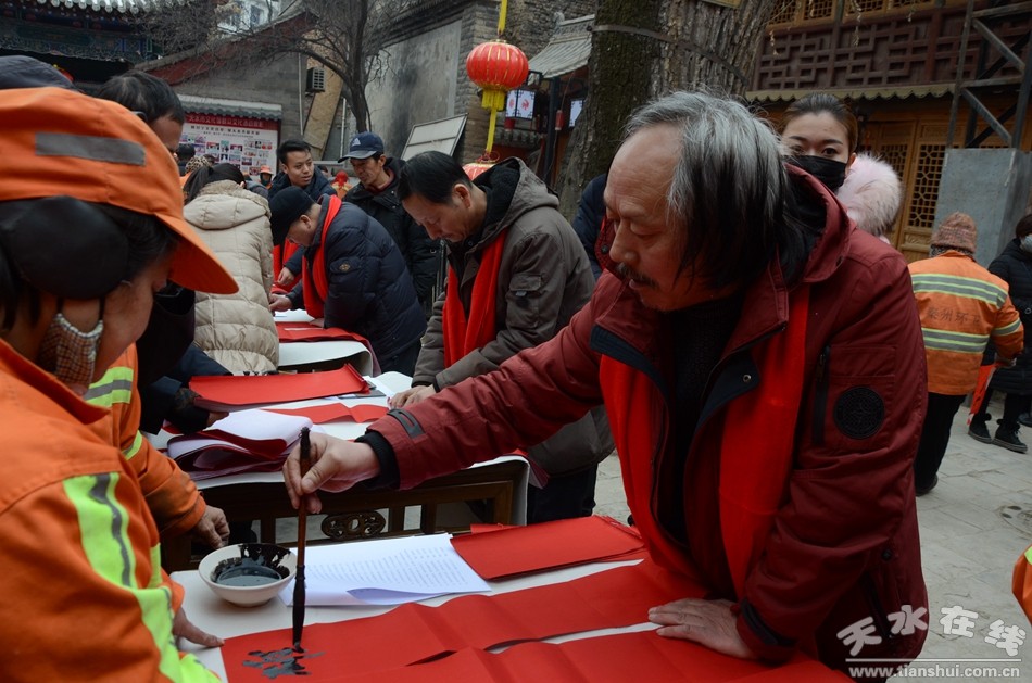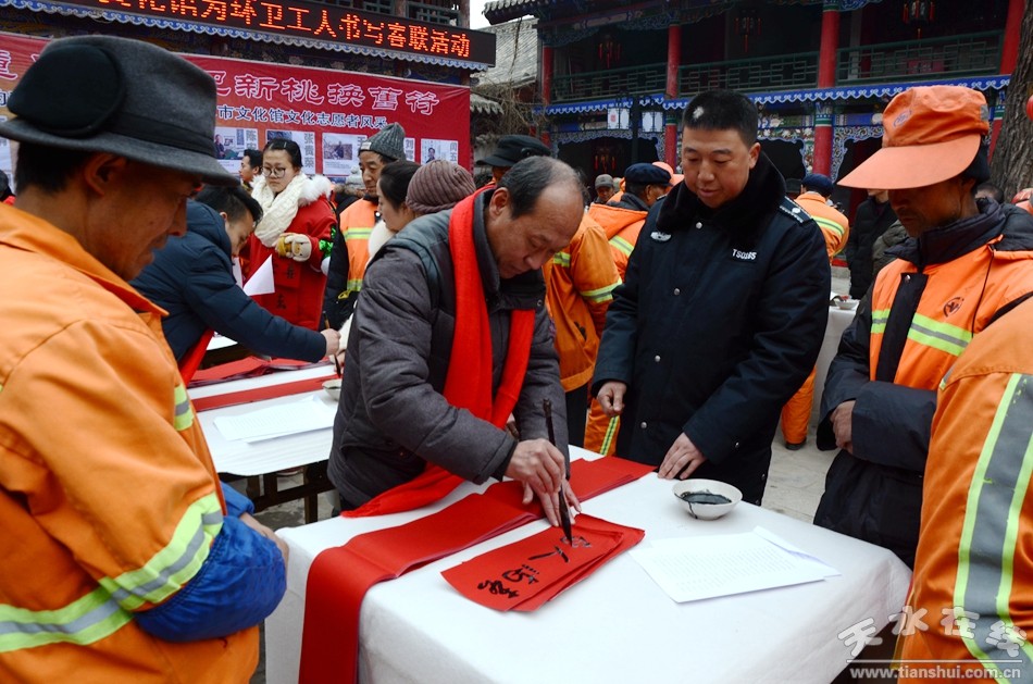 2月8日,新春佳節(jié)來(lái)臨之際,一場(chǎng)以丁酉小年“迎春送!报D―天水市文化館為環(huán)衛(wèi)工人書(shū)寫(xiě)春聯(lián)活動(dòng)拉開(kāi)帷幕。來(lái)自天水市20位知名書(shū)畫(huà)家、書(shū)法志愿者揮毫潑墨,以送春聯(lián)的方式慰問(wèn)環(huán)衛(wèi)工人,為他們送上新春的美好祝福和期盼。