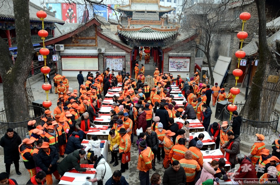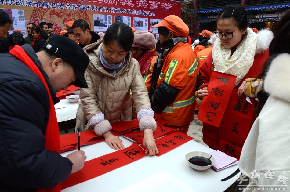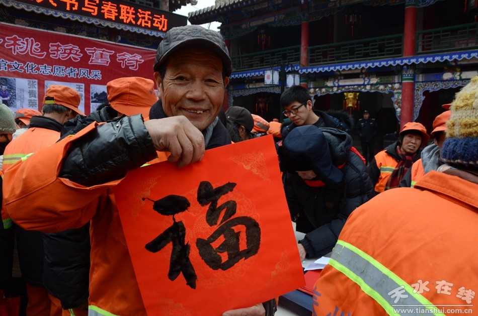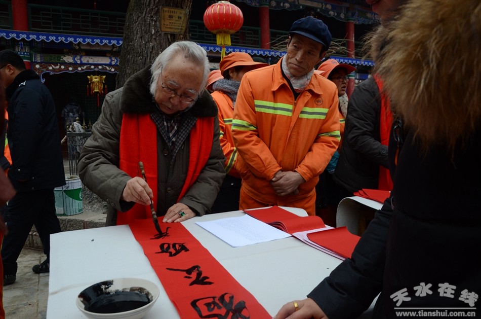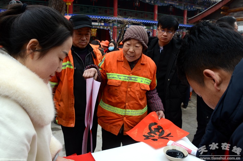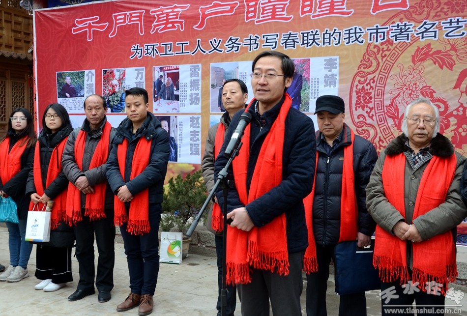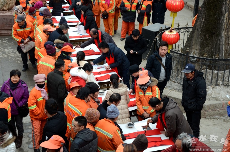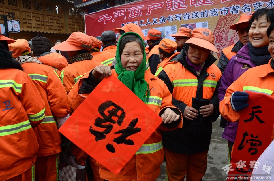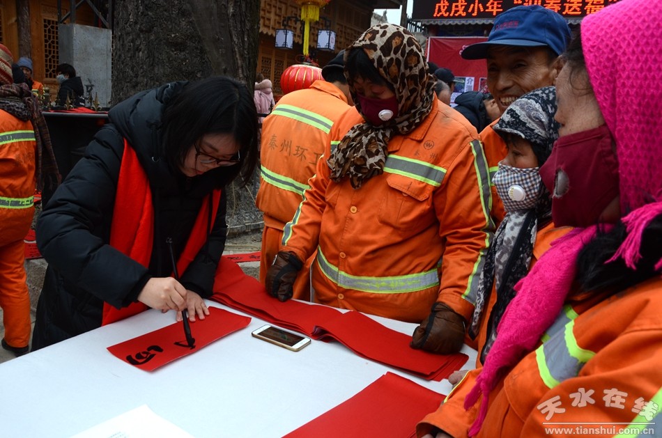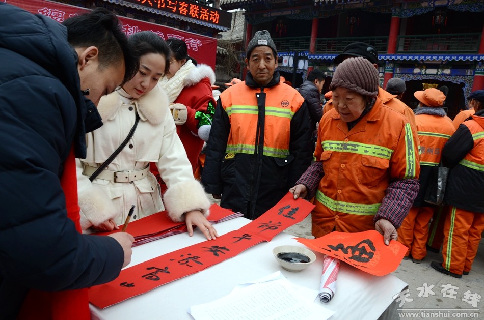 2月8日,新春佳節(jié)來(lái)臨之際,一場(chǎng)以丁酉小年“迎春送!报D―天水市文化館為環(huán)衛(wèi)工人書(shū)寫(xiě)春聯(lián)活動(dòng)拉開(kāi)帷幕。來(lái)自天水市20位知名書(shū)畫(huà)家、書(shū)法志愿者揮毫潑墨,以送春聯(lián)的方式慰問(wèn)環(huán)衛(wèi)工人,為他們送上新春的美好祝福和期盼。