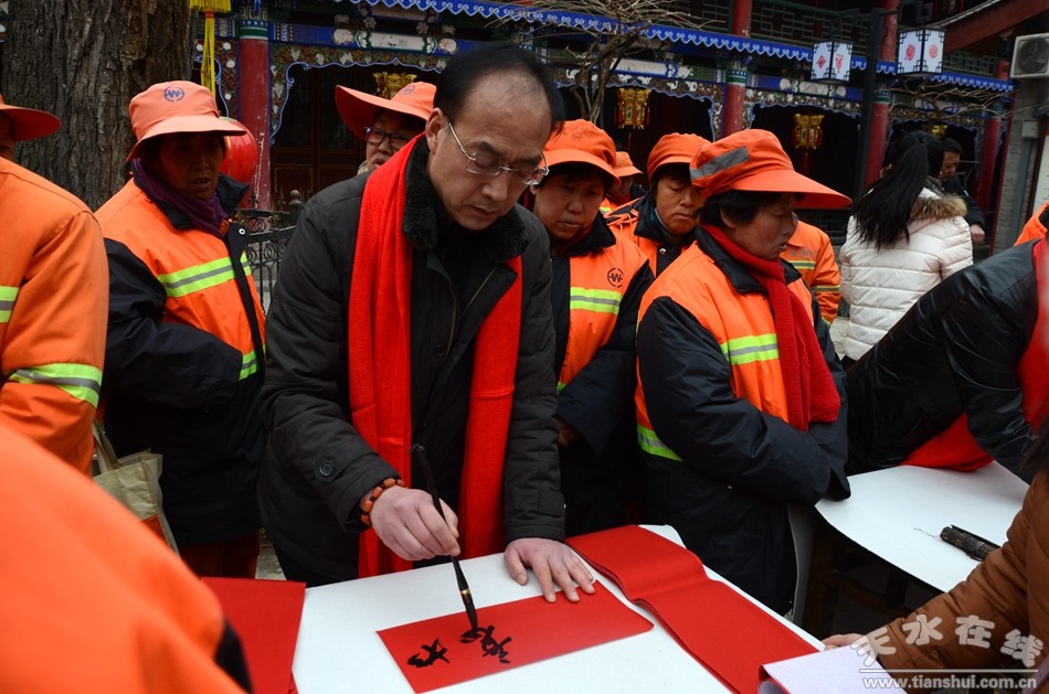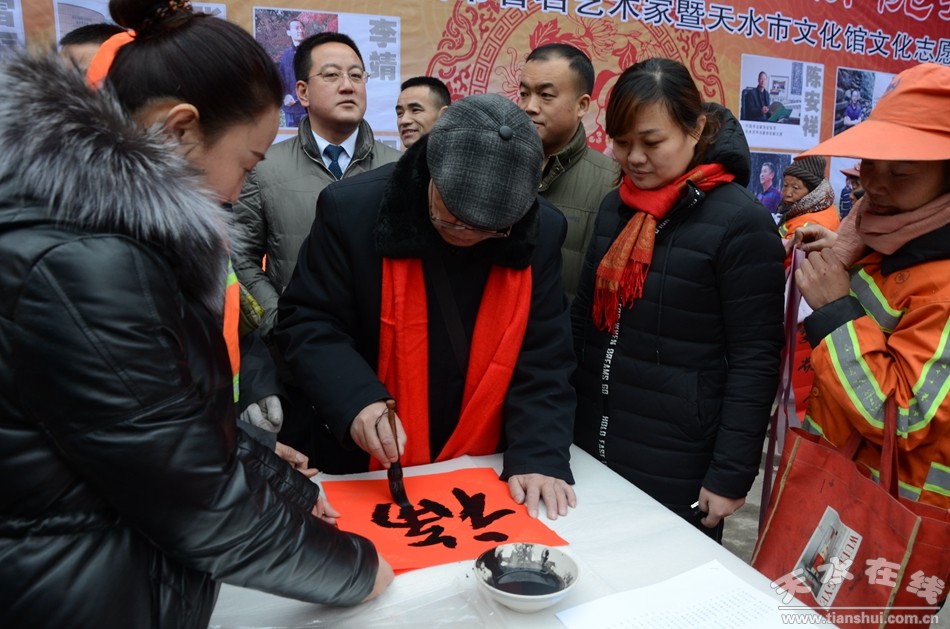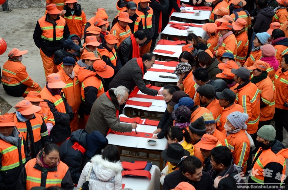 由天水市文化館、秦州區(qū)城鄉(xiāng)環(huán)境衛(wèi)生管理局主辦的本次活動(dòng),邀請(qǐng)?zhí)焖械闹麜?shū)畫(huà)家介滿盈、萬(wàn)惠民、雷振揚(yáng)、張平、李靖等老中青20位知名書(shū)畫(huà)家,以贈(zèng)送筆墨的方式把新春的祝愿送到環(huán)衛(wèi)工人的心坎上,讓他們感受到新春佳節(jié)的暖意。