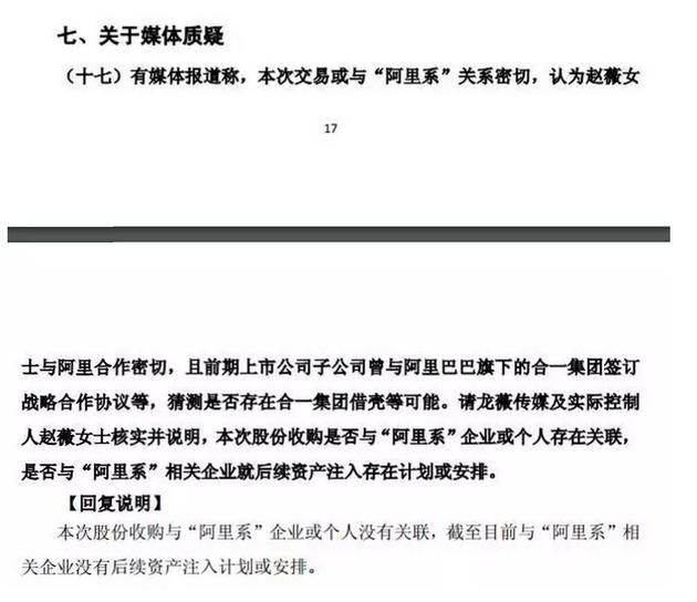 對此,龍薇傳媒回復稱:“本次股份收購與'阿里系'企業(yè)或個人沒有關聯(lián),截至目前與'阿里系'相關企業(yè)沒有后續(xù)資產(chǎn)注入計劃或安排!