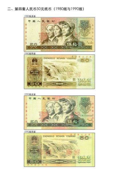 。ǘ┑谒奶兹嗣駧50元紙幣。其主色調(diào)為黑茶,正面圖案為工人、農(nóng)民、知識(shí)分子頭像,背面圖案為黃河壺口。