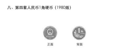 (八)第四套人民幣1角硬幣。其材質(zhì)為鋁鎂合金,正面圖案為國(guó)徽、國(guó)名、漢語(yǔ)拼音國(guó)名、年號(hào),背面圖案為菊花、面額。