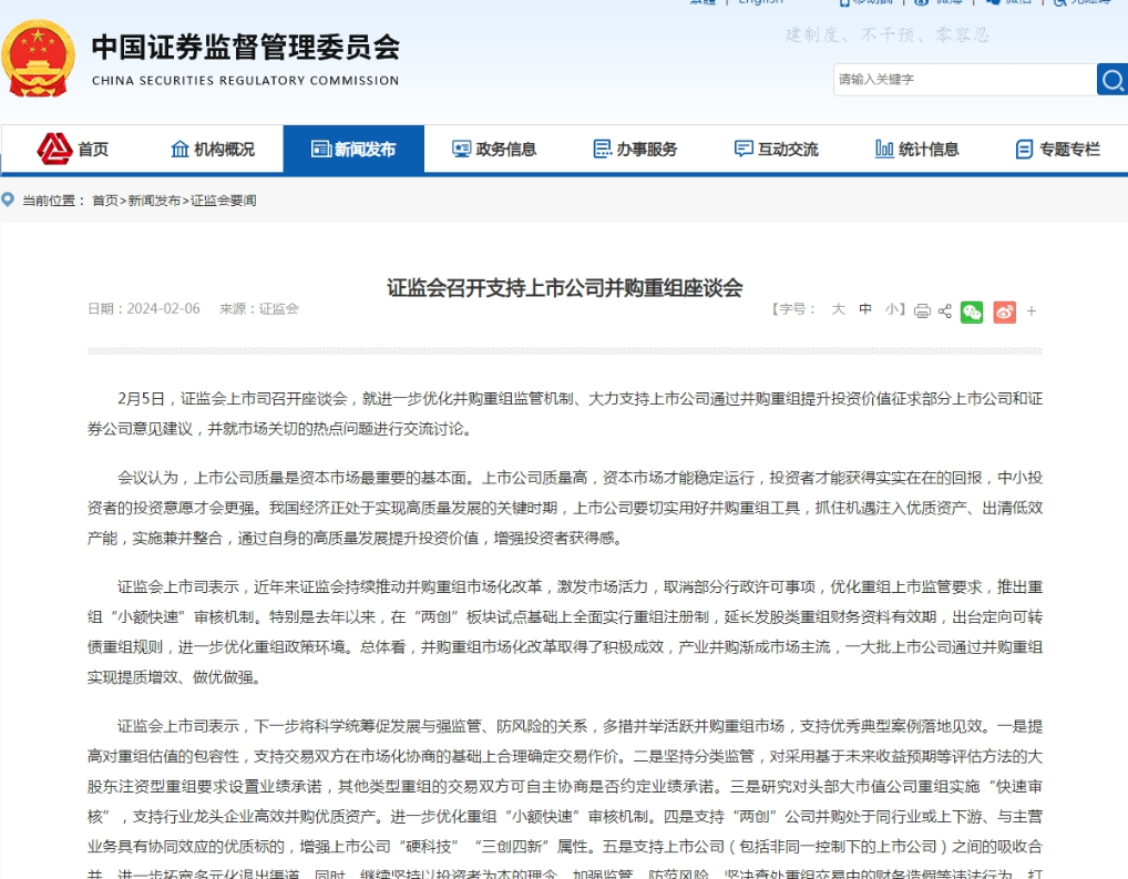 證監(jiān)會官網(wǎng)6日發(fā)布消息稱,證監(jiān)會上市司近日表示,將科學(xué)統(tǒng)籌促發(fā)展與強監(jiān)管、防風險的關(guān)系,多措并舉活躍并購重組市場,支持優(yōu)秀典型案例落地見效。