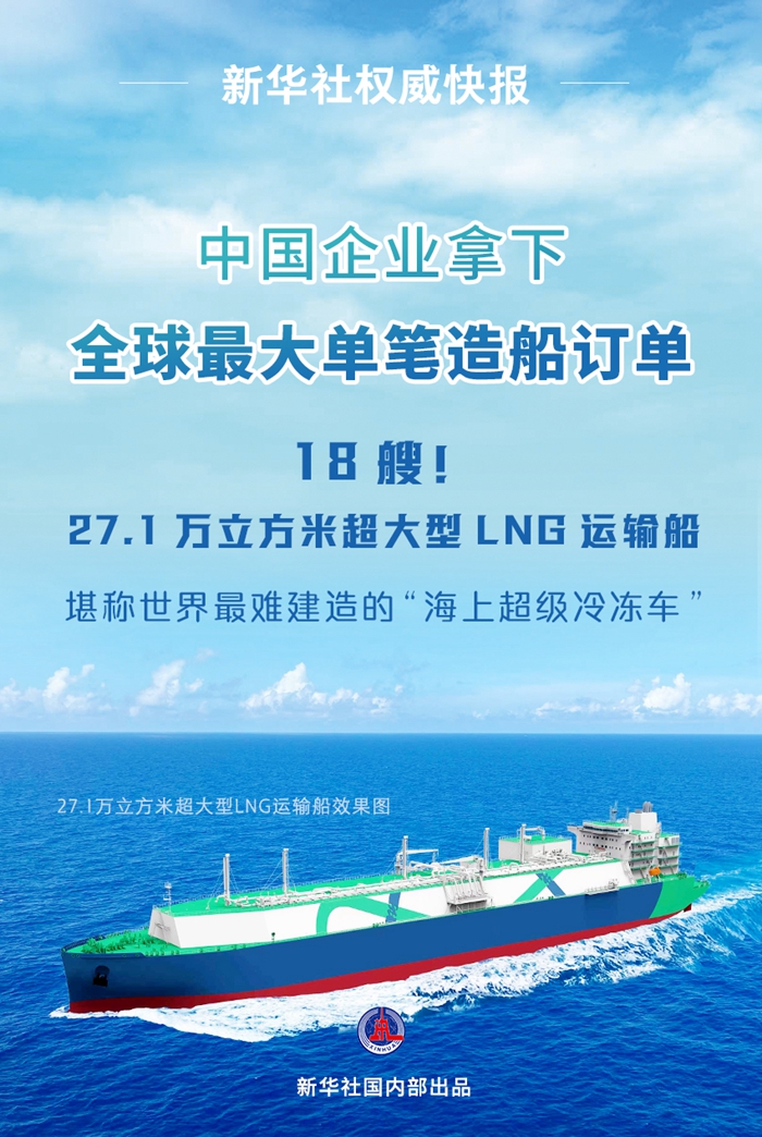 中國船舶集團(tuán)將為卡塔爾能源公司建造18艘27.1萬立方米超大型LNG(液化天然氣)運(yùn)輸船,簽約儀式4月29日在京舉行,創(chuàng)下全球最大單筆造船訂單紀(jì)錄。
