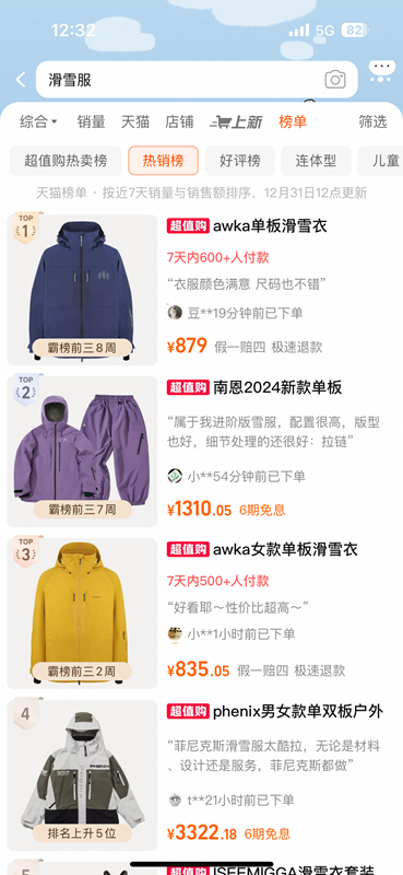 天貓“雙旦”禮遇季期間,國產(chǎn)品牌ISEE MIGGA成交同比增長超500%,awka 3L滑雪服單日賣2000多件。在天貓滑雪服銷量榜(截至2024年12月31日)前10名中,7個均為國產(chǎn)品牌。