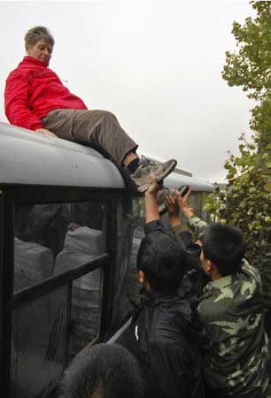 十幾位奧地利老人返回座位,靜靜地等候?qū)в蔚南乱徊街噶。消瘦的導游從狹窄的逃生窗口爬出,向過往車輛求援,但由于天巉公路馬家嘴段滑坡,過往車輛非常少。幾分鐘過去,定西公路段的一輛桑塔納轎車經(jīng)過事發(fā)路段,車上的工作人員見狀馬上停車,幫助尋找拖車,這時一輛開往榆中的大型貨車看到有人招手,將車停到路邊,問清情況后從車廂內(nèi)抽出鋼絲拴住大巴車尾部。在蒙蒙細雨中,救援緊張地進行著,包括記者在內(nèi)的4輛車上的乘客看到路邊的救援后,也先后停車伸出援手。大巴車內(nèi)的高德克老人見狀也爬出車外,冒雨站在道路中央指揮過往車輛通行。準備工作一切就緒后,大巴車司機扶著老人一一從大巴車頂氣窗里鉆出,導游與記者在車旁搭成人梯,先用雙手抓住老人的雙腳,然后讓老人慢慢滑下,讓他們坐到自己的肩頭,再抓住老人的胳膊,抱緊他們的腰,讓他們安全落地。