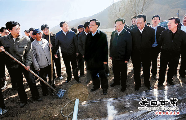 2月27日,省委書(shū)記、省人大常委會(huì)主任陸浩深入白銀市考察旱情。這是陸浩在會(huì)寧縣會(huì)師鎮(zhèn)東河村考察旱情和全膜雙壟溝播種植保墑情況。本報(bào)記者 呂建榮 攝