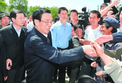 。5月19日,賀國強在王三運、劉偉平、歐陽堅等陪同下深入岷縣災(zāi)區(qū),考察指導(dǎo)搶險救災(zāi)和災(zāi)后重建工作,看望慰問受災(zāi)群眾和搶險救災(zāi)人員。本報記者高檣 )