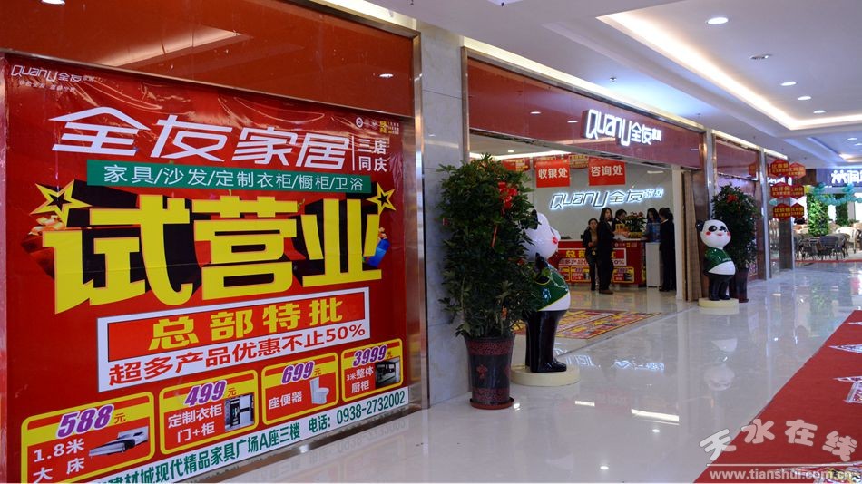 2016年12月31日,位于天水市麥積區(qū)橋南家居建材城現(xiàn)代精品家具廣場A座三樓的全友家居大型綜合館正式開始試營業(yè)。這個全友家居綜合館占地4000多平方米,堪稱西北面積最大、品類最全。綜合館邀您參加開業(yè)酬賓活動,共同見證家居建材行業(yè)又一大型賣場耀世起航。
