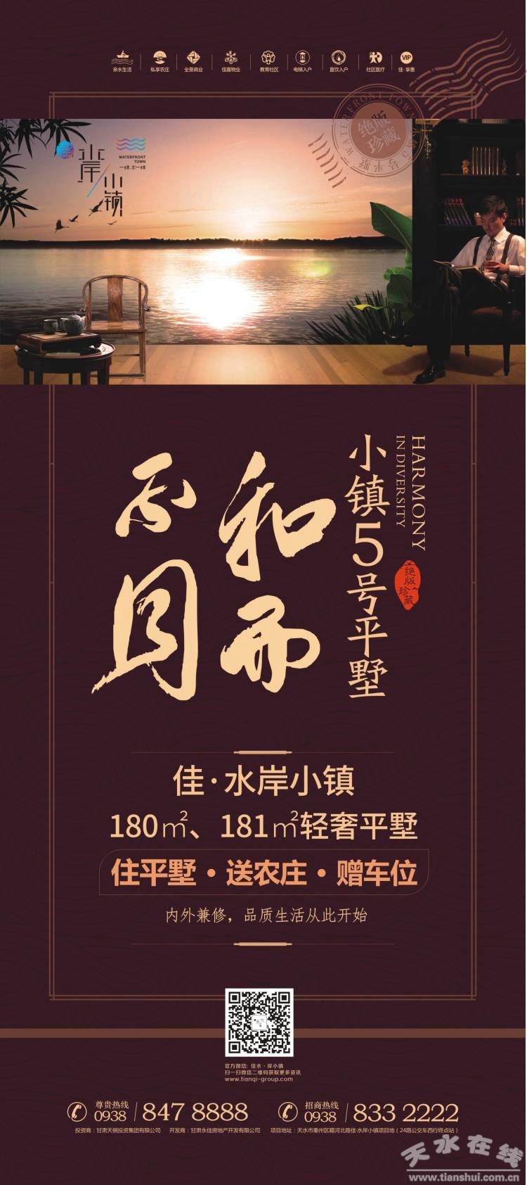 佳水岸小鎮(zhèn)·小鎮(zhèn)5號平墅,天水最宜人居品質大盤之一!依傍藉河水岸,離塵卻不離城!在這里,您再也不用擔心霧霾侵殺您的肺,廢氣感染您的家;在這里,讓陽光灑落在每一個角落,讓和煦的微風輕撫您的面龐,還您一片最初的藍天白云!1000畝天靖山生態(tài)農(nóng)莊,獨享藉河水聲潺潺,小鎮(zhèn)5號平墅讓您與PM2.5從此分道揚鑣。