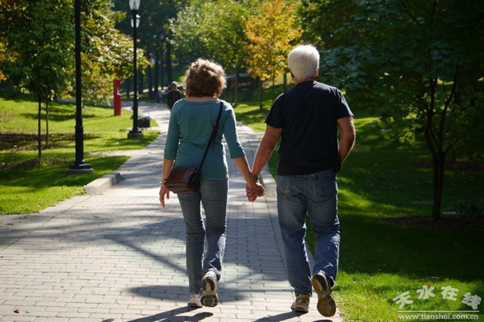 夕陽下,老兩口攜手穿過精心打造的公園式園林