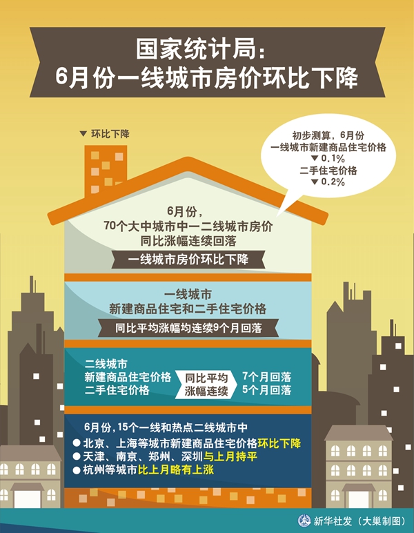 圖表:國(guó)家統(tǒng)計(jì)局:6月份一線(xiàn)城市房?jī)r(jià)環(huán)比下降 新華社發(fā) 大巢制圖