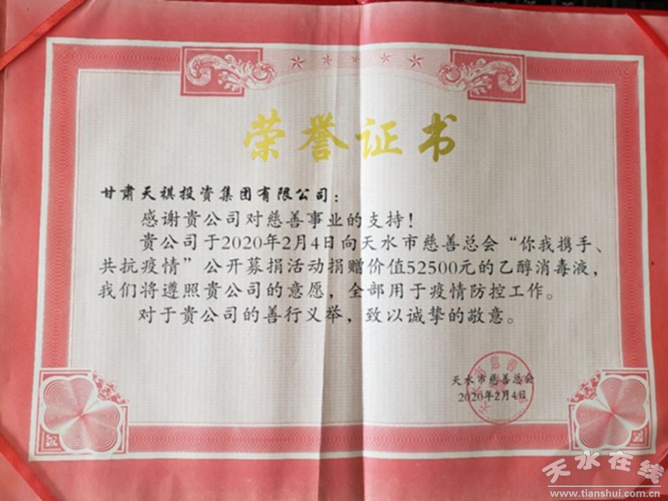 甘肅天祺投資集團(tuán)高層以電話會議形式召開“與天水市民共克時艱”的專題領(lǐng)導(dǎo)小組會議,對天水疫情防控工作主動承擔(dān),切實(shí)履行社會責(zé)任,全力配合各級政府部門共同做好疫情防控工作。在消毒物資極其緊張的情況下主動聯(lián)系資源購置,積極發(fā)揚(yáng)“一方有難、八方支援”的民族精神,帶領(lǐng)企業(yè)齊心協(xié)力,踴躍奉獻(xiàn)愛心,為天水市慈善總會、天水市房地產(chǎn)協(xié)會和市衛(wèi)健系統(tǒng)、公安系統(tǒng)、民政系統(tǒng)等部門捐贈價值52500元的5L裝75%醫(yī)用消毒酒精500桶,用于支援天水市防控防疫工作。