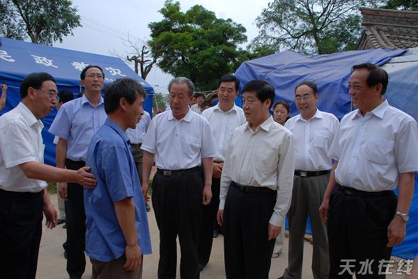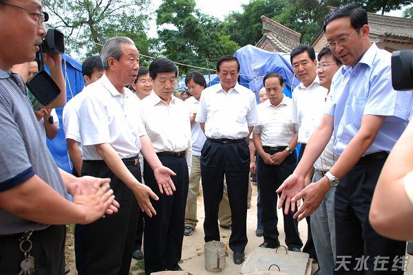 7月12日,馬鐵山(右三)在天水市秦州區(qū)皂郊鎮(zhèn)白家山村看望慰問災(zāi)民(配圖:天水在線)