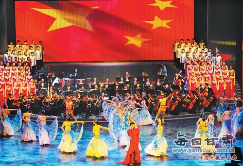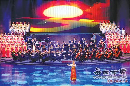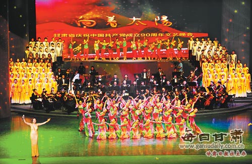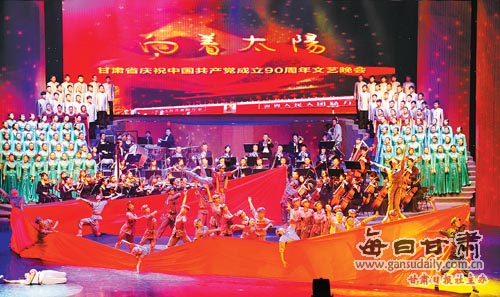 6月30日晚,“向著太陽”——甘肅省慶祝中國共產(chǎn)黨成立90周年文藝晚會在新落成的甘肅大劇院舉行。精彩紛呈的歌舞勾勒出中國共產(chǎn)黨的輝煌歷史,熱烈沸騰的掌聲傳達出觀眾共同的心聲。