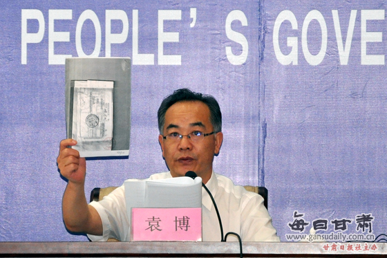 甘肅省紅十字會(huì)秘書長(zhǎng)袁博向新聞媒體公布調(diào)查結(jié)果并出示相關(guān)票據(jù)、合同、文件的復(fù)印件。每日甘肅網(wǎng) 李娜 肖剛 攝
