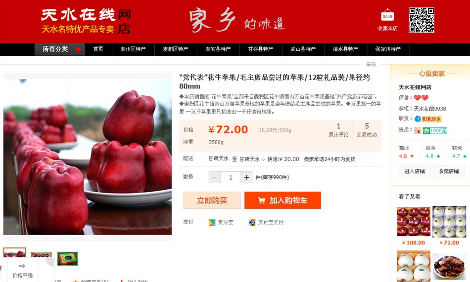 (淘寶“天水在線”網(wǎng)店正在銷(xiāo)售正宗的天水“花牛蘋(píng)果”)