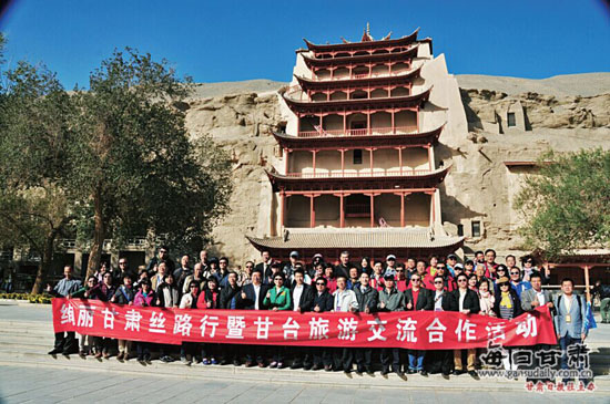 甘臺(tái)旅游交流合作團(tuán)在敦煌莫高窟前合影。