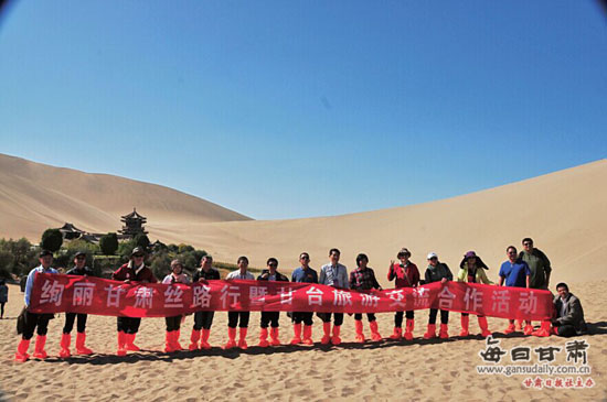 甘臺(tái)旅游合作交流團(tuán)體驗(yàn)敦煌鳴沙山、月牙泉美景。