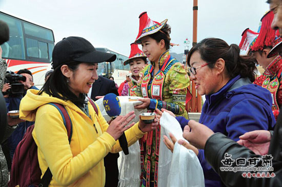 甘臺(tái)旅游交流合作團(tuán)在張掖康樂(lè)草原接受敬酒。