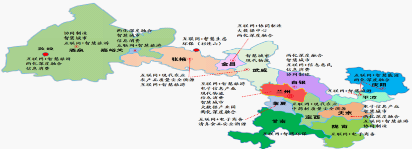 結(jié)合區(qū)域經(jīng)濟(jì)特色和信息化發(fā)展水平,布局各地信息化發(fā)展重點(diǎn),依托蘭州新區(qū)和金昌市建設(shè)大數(shù)據(jù)產(chǎn)業(yè)園區(qū)和大數(shù)據(jù)中心,根據(jù)各市州優(yōu)勢(shì),推動(dòng)智慧城市(蘭州、白銀、天水、武威、酒泉、嘉峪關(guān))、信息消費(fèi)城市(蘭州、白銀、嘉峪關(guān)、敦煌等)、“兩化”深度融合城市(蘭州、天水、白銀、金昌、慶陽(yáng)、嘉峪關(guān)、平?jīng)龅龋┑脑圏c(diǎn)建設(shè),開展“互聯(lián)網(wǎng)+”智慧旅游(蘭州、敦煌、酒泉、嘉峪關(guān)、張掖、武威、天水、平?jīng)龅龋ⅰ盎ヂ?lián)網(wǎng)+”生態(tài)環(huán)保(張掖、甘南等)、“互聯(lián)網(wǎng)+”現(xiàn)代農(nóng)業(yè)(張掖、定西、隴南等)、“互聯(lián)網(wǎng)+”電子商務(wù)(隴南、臨夏)的新模式,打造現(xiàn)代物流(蘭州、蘭州新區(qū)、武威等)、協(xié)同制造(蘭州、天水、酒泉、金昌、白銀等)和電子信息產(chǎn)業(yè)(蘭州、蘭州新區(qū)、天水)基地建設(shè),逐漸引導(dǎo)形成具有區(qū)域特色的全省信息化發(fā)展戰(zhàn)略新格局(如圖所示)。