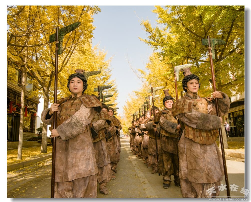11月份,“黃金大道”迎接你,還有青年路的“狂歡節(jié)”。被秋日染得金黃的銀杏葉,已經不知不覺鋪了滿地。陽光依舊透過枝杈撒下溫暖的斑駁,金黃的葉子被一陣風吹得沙沙作響。或駐足或行走的游人驀地發(fā)現(xiàn),遠處身披鎧甲、整齊莊重的“大秦勇士”正在鏗鏘走來。 一場全民參與的“狂歡節(jié)”正式上演。