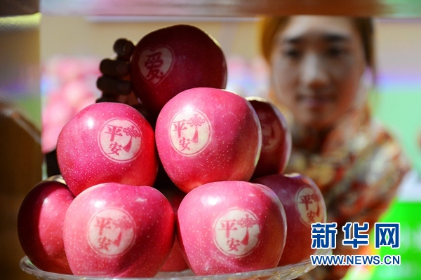 一名女孩在靜寧縣蘋果節(jié)上欣賞帶圖案的“藝術(shù)”蘋果。新華社記者 陳斌 攝(資料圖片)