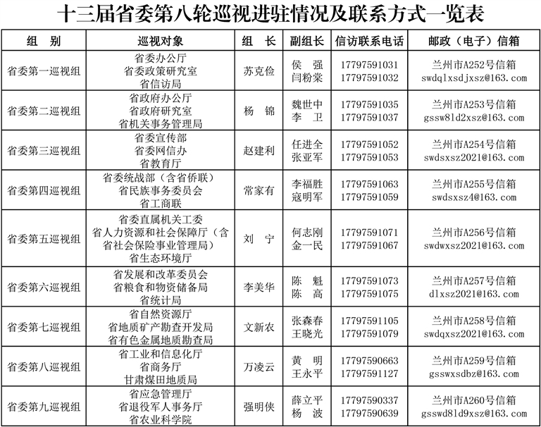 經(jīng)省委決定,十三屆省委第八輪巡視對(duì)省委辦公廳、省委政策研究室、省信訪(fǎng)局、省政府辦公廳、省政府研究室、省機(jī)關(guān)事務(wù)管理局、省委宣傳部、省委網(wǎng)信辦、省教育廳、省委統(tǒng)戰(zhàn)部(含省僑聯(lián))、省民族事務(wù)委員會(huì)、省工商聯(lián)、省委直屬機(jī)關(guān)工委、省人力資源和社會(huì)保障廳(含省社會(huì)保險(xiǎn)事業(yè)管理局)、省生態(tài)環(huán)境廳、省發(fā)展和改革委員會(huì)、省糧食和物資儲(chǔ)備局、省統(tǒng)計(jì)局、省自然資源廳、省地質(zhì)礦產(chǎn)勘查開(kāi)發(fā)局、省有色金屬地質(zhì)勘查局、省工業(yè)和信息化廳、省商務(wù)廳、甘肅煤田地質(zhì)局、省應(yīng)急管理廳、省退役軍人事務(wù)廳、省農(nóng)業(yè)科學(xué)院等27個(gè)省級(jí)黨和國(guó)家機(jī)關(guān)單位開(kāi)展常規(guī)巡視。