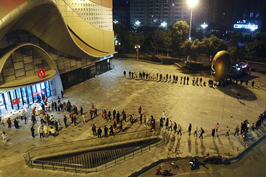 10月21日凌晨,在蘭州市城關區(qū)天水路一核酸檢測采樣點,市民有序排隊等待。(無人機照片) 新華社記者范培珅 攝