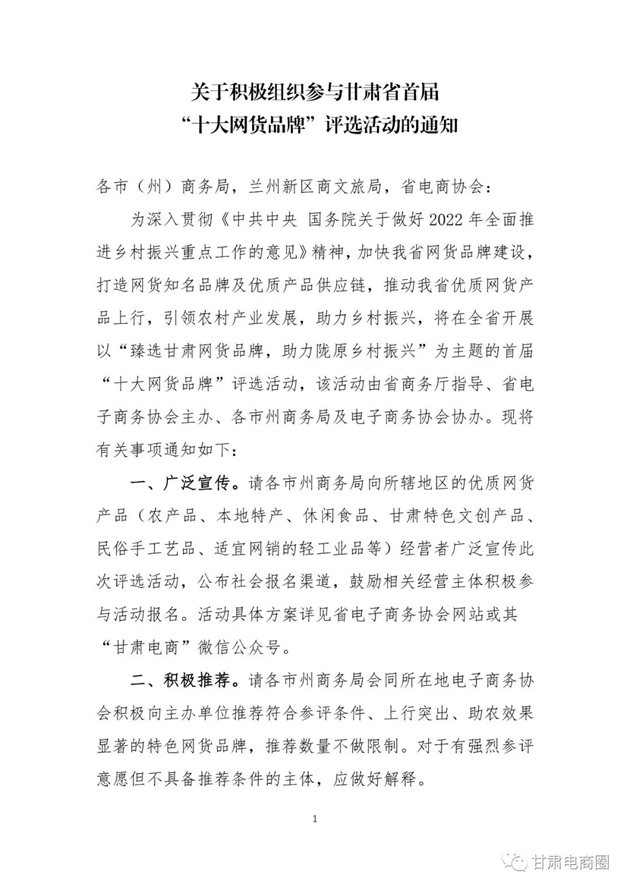 關于積極組織參與甘肅省首屆“十大網(wǎng)貨品牌”評選活動的通知