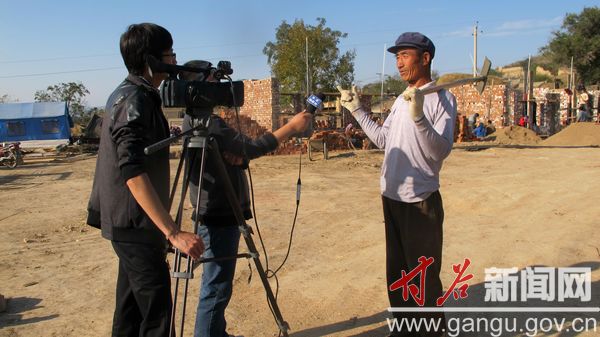 (老莊村民王增福正在新建的老莊村小學(xué)現(xiàn)場接受采訪)