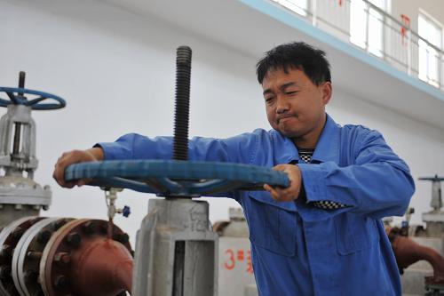 4月16日,在甘肅省甘谷縣西北部農(nóng)村飲水工程供水站,工作人員王棟在操作上水泵閥門。新華社記者 陳斌 攝