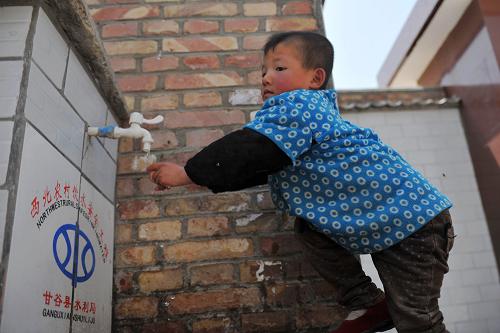 4月16日,在甘肅省甘谷縣謝家灣鄉(xiāng)溝灘村,一名小朋友在家里的自來水龍頭旁洗手。新華社記者 陳斌 攝