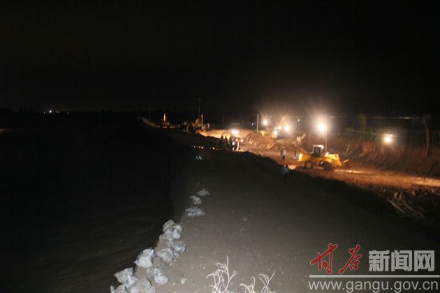當(dāng)晚凌晨12時(shí)許,記者在渭河新興鎮(zhèn)十甲村段搶險(xiǎn)工程現(xiàn)場(chǎng)看到,各類大型工程車、運(yùn)輸車來(lái)回穿梭,各種防洪石、預(yù)制板、鉛絲籠、麻袋等防汛物資堆滿一地。由水利、新興鎮(zhèn)相關(guān)部門干部職工以及當(dāng)?shù)厝罕娊M成的應(yīng)急搶險(xiǎn)隊(duì)伍緊張有序地忙碌在現(xiàn)場(chǎng),一袋袋防洪石及一批批其他防洪物資由大型工程機(jī)械填充到被洪水沖毀的河堤缺口處。經(jīng)過(guò)數(shù)百名搶險(xiǎn)人員10個(gè)小時(shí)的戰(zhàn)斗, 投入機(jī)械20余臺(tái),拋投了2萬(wàn)余方石料,垮塌的河堤終于排除了危險(xiǎn),幾百名搶險(xiǎn)人員仍挑燈夜戰(zhàn)渭河岸,加固河堤。