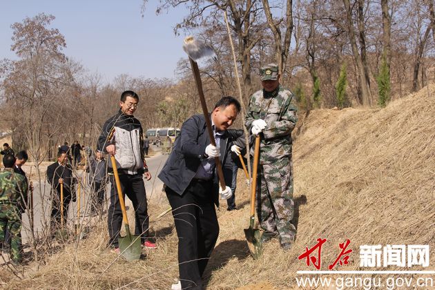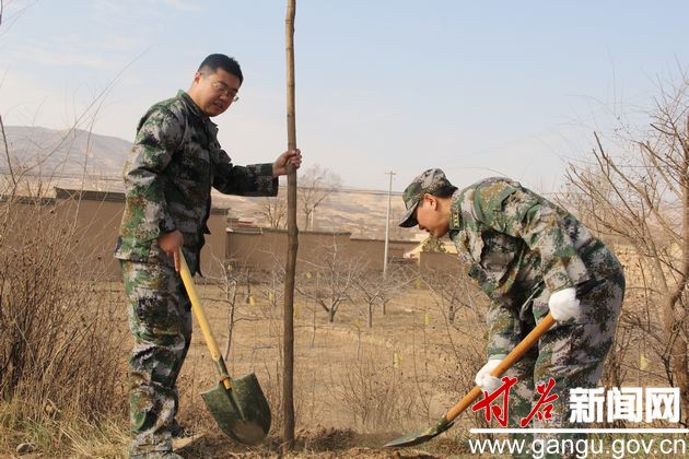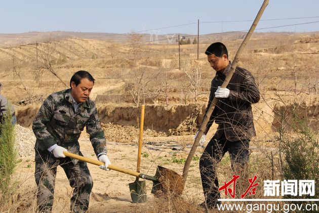 (縣委常委、人武部部長(zhǎng)田暉和副縣長(zhǎng)王龍強(qiáng)在植樹(shù))