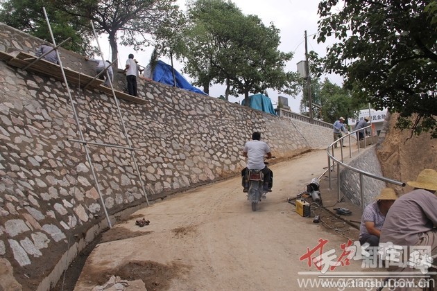 在白家灣鄉(xiāng)茍家峴村村頭,施工人員正忙著修筑護坡和安裝欄桿。結(jié)實的護坡和亮燦燦的欄桿,讓這個小村落多少顯得有點與眾不同。而這都得益于美麗鄉(xiāng)村建設(shè)工作的開展。說起村子被作為美麗鄉(xiāng)村建設(shè)示范點的事,村民黃碎敏話語里透露著一股自豪和滿意。