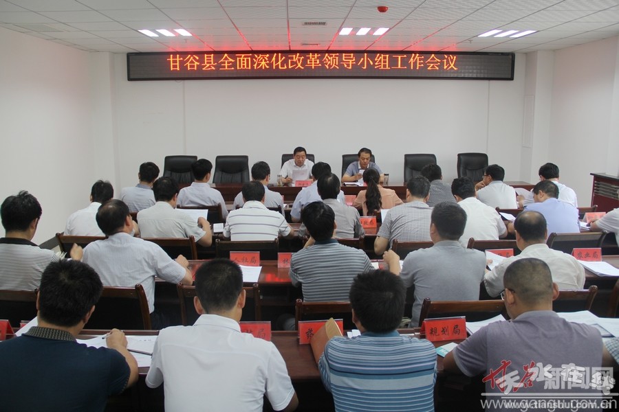 8月15日,甘谷縣召開全面深化改革領(lǐng)導(dǎo)小組工作會議,縣委副書記李尚平主持會議并講話,縣政協(xié)副主席、縣委辦主任鄭建子宣讀有關(guān)文件并就全縣全面深化改革工作有關(guān)事項(xiàng)做了說明,縣委全面深化改革領(lǐng)導(dǎo)小組成員單位主要負(fù)責(zé)人共計(jì)50余人參加會議。