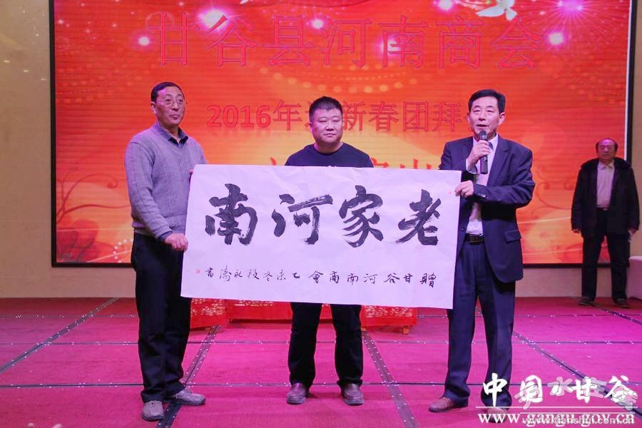 1月18日晚,甘谷縣河南商會舉行2016年迎新春團拜會,在甘谷創(chuàng)業(yè)的甘谷縣河南商會會員們歡聚一堂,話新年、敘成就、謀發(fā)展。甘肅省河南商會執(zhí)行會長、蘭州市安寧區(qū)工商聯(lián)副主席姚西虎,甘肅省河南商會天水辦事處主任趙偉,縣人大常委會副主任王百家、李富國,縣政協(xié)副主席王金生、陳旭等出席團拜會。