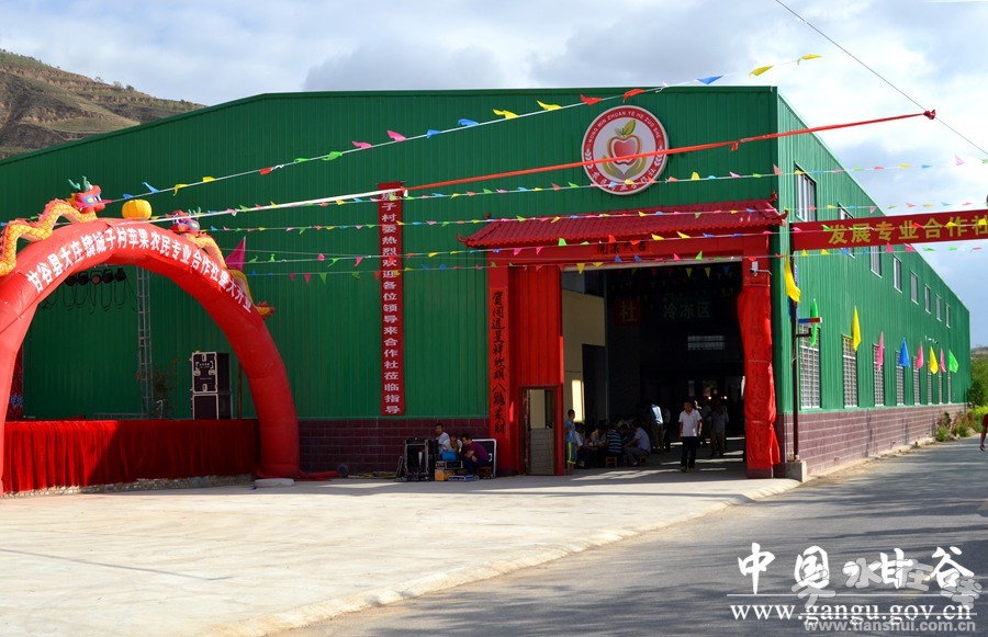 炎炎烈日,記者來到甘谷縣大莊鎮(zhèn)城子村,一座新建容量達800噸的果庫矗立在通甘公路旁,當天記者正趕上城子村蘋果農(nóng)民專業(yè)合作社揭牌成立,現(xiàn)場人山人海,對當?shù)毓r(nóng)來說,這是一件關乎切身利益的大事。
