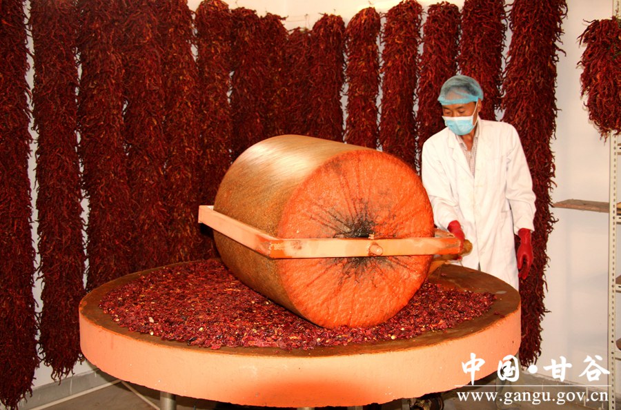 在新興鎮(zhèn)康家灘村三社合一辣椒加工車(chē)間,操作工人系統(tǒng)地展示了辣椒烘干、切絲、搗碎、包裝等現(xiàn)代化加工流程,但不管流程怎么演變,用石臼砸或者石磨碾的傳統(tǒng)制作方法,總是甘谷辣椒少不了的一個(gè)加工環(huán)節(jié),而這也正是甘谷辣椒遠(yuǎn)近聞名的秘密所在。