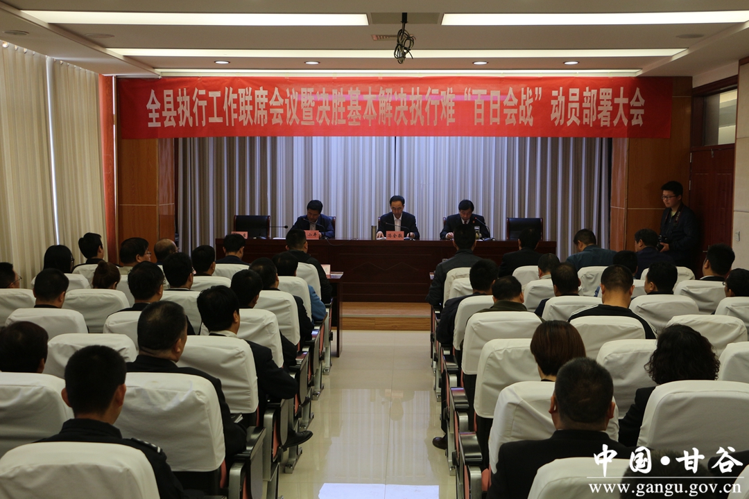4月26日,甘谷縣召開(kāi)執(zhí)行工作聯(lián)席會(huì)議暨決勝基本解決執(zhí)行難“百日會(huì)戰(zhàn)”動(dòng)員部署大會(huì)?h委常委、政法委書(shū)記馮全敬出席會(huì)議并講話(huà),縣執(zhí)行聯(lián)席會(huì)議成員單位負(fù)責(zé)人和縣法院黨組全體成員、各庭室負(fù)責(zé)人及執(zhí)行局全體干警共計(jì)60余人參加會(huì)議。