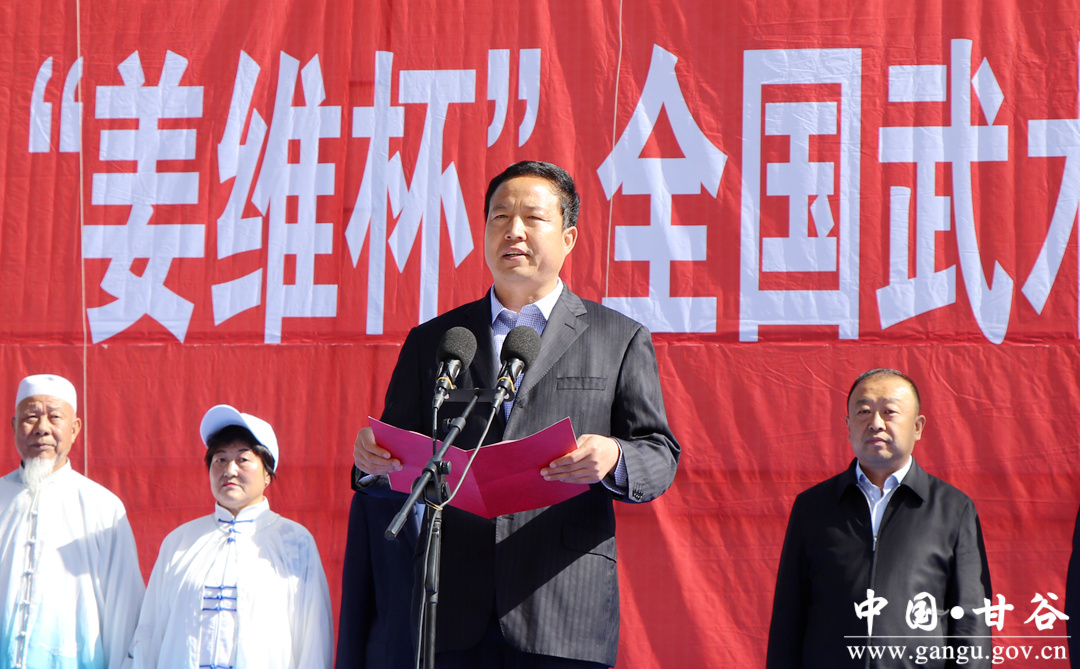 牛武軍在致辭中說,甘谷歷史悠久,人文薈萃,是“全國武術(shù)之鄉(xiāng)”,素有崇文尚武的優(yōu)良傳統(tǒng),武術(shù)文化源遠(yuǎn)流長(zhǎng),數(shù)千年來傳承不息,涌現(xiàn)出以蜀漢大將軍姜維為代表的一大批杰出人物,形成了極富地方特色的傳統(tǒng)武術(shù)文化。近年來,縣委、縣政府大力支持武術(shù)文化研究,深入挖掘整理傳統(tǒng)武術(shù)套路,廣泛組織開展各類武術(shù)交流活動(dòng),武術(shù)事業(yè)得到了長(zhǎng)足的發(fā)展,廣大群眾習(xí)武健身蔚然成風(fēng),武術(shù)健兒在國內(nèi)大賽中屢獲殊榮,我縣先后榮獲“全國群眾體育先進(jìn)縣”和“全省發(fā)展體育產(chǎn)業(yè)先進(jìn)縣”稱號(hào)。這次“姜維杯”武術(shù)交流大會(huì)的成功舉辦,為武術(shù)健兒搭建了交流切磋的良好平臺(tái),對(duì)培養(yǎng)新型武術(shù)人才,實(shí)施全民健身戰(zhàn)略,推動(dòng)武術(shù)事業(yè)發(fā)展具有十分重要的意義。相信通過各位武術(shù)名家和運(yùn)動(dòng)員的交流切磋,這次大會(huì)一定能夠進(jìn)一步傳承和弘揚(yáng)中華優(yōu)秀武術(shù)文化,打造姜維武術(shù)品牌,將中華武術(shù)發(fā)揚(yáng)光大,共同弘揚(yáng)國粹。