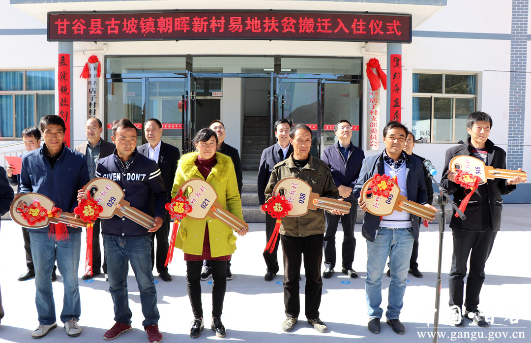 山明水凈菊花香,樹樹深紅出淺黃。10月10日,甘谷縣古坡鎮(zhèn)舉行朝暉新村易地扶貧搬遷入住儀式。省發(fā)改委利用外資處處長成偉;縣委常委、常務(wù)副縣長孟曉龍,縣委常委、副縣長王志高,副縣長李蘭平出席儀式;縣發(fā)改局、住建局、規(guī)劃局、財(cái)政局、水務(wù)局、恒通公司等部門單位負(fù)責(zé)人及鎮(zhèn)村兩級干部及住戶的代表工180多人參加儀式。