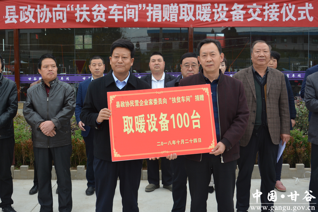 10月24日,甘谷縣政協(xié)向“扶貧車間”捐贈(zèng)取暖設(shè)備交接儀式在六峰鎮(zhèn)“扶貧車間”舉行?h政協(xié)主席馬驥出席交接儀式并講話;縣政協(xié)副主席董成斌向人社局負(fù)責(zé)人移交了取暖設(shè)備,縣政協(xié)副主席郭長(zhǎng)勝主持交接儀式;縣直有關(guān)部門負(fù)責(zé)人、部分政協(xié)民營(yíng)企業(yè)家委員及六峰鎮(zhèn)“扶貧車間”工作人員參加交接儀式。