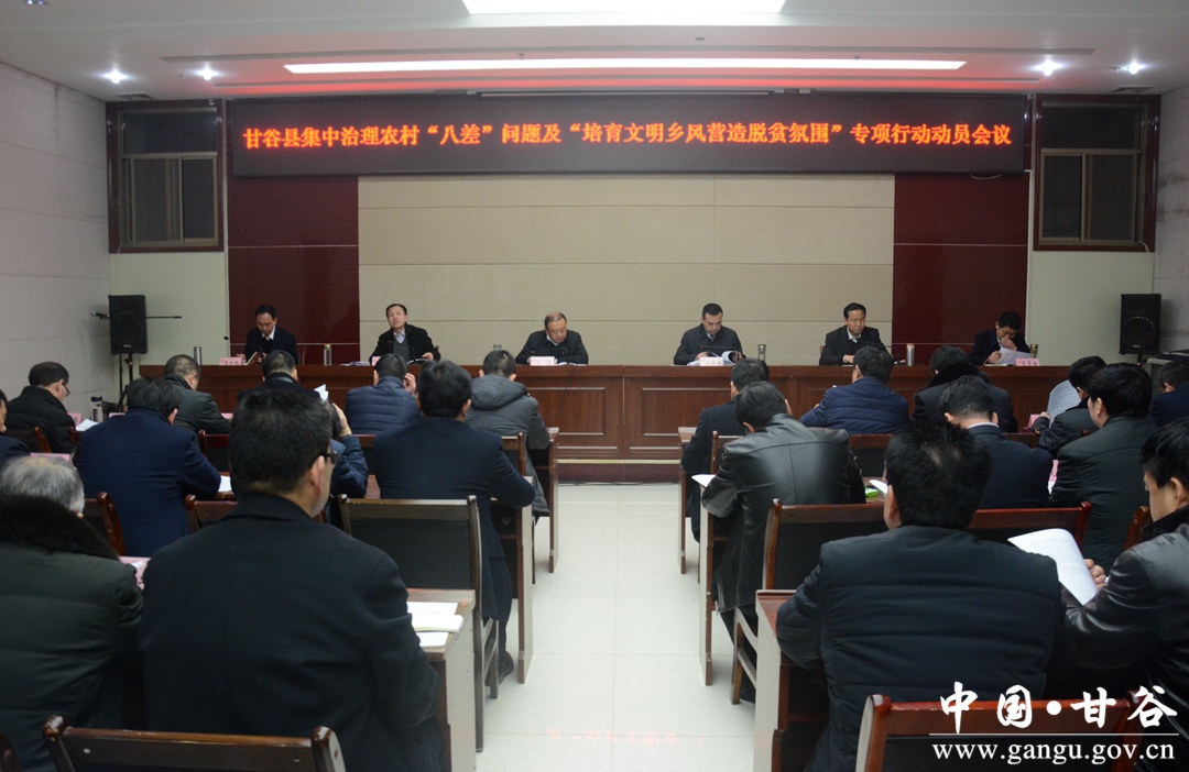 1月10日,甘谷縣召開集中治理農(nóng)村“八差”問題暨“培育文明鄉(xiāng)風(fēng)營造脫貧氛圍”專項(xiàng)行動動員會,貫徹落實(shí)市委、市政府相關(guān)部署要求,全面啟動治理農(nóng)村“八差”問題和“培育文明鄉(xiāng)風(fēng)營造脫貧氛圍”專項(xiàng)行動,動員全縣上下提高政治站位,強(qiáng)化責(zé)任擔(dān)當(dāng),集中力量開展攻堅(jiān)行動,徹底改善鄉(xiāng)村面貌和群眾精神風(fēng)貌,為打贏打好脫貧攻堅(jiān)戰(zhàn)、實(shí)施鄉(xiāng)村振興戰(zhàn)略提供有力保障。